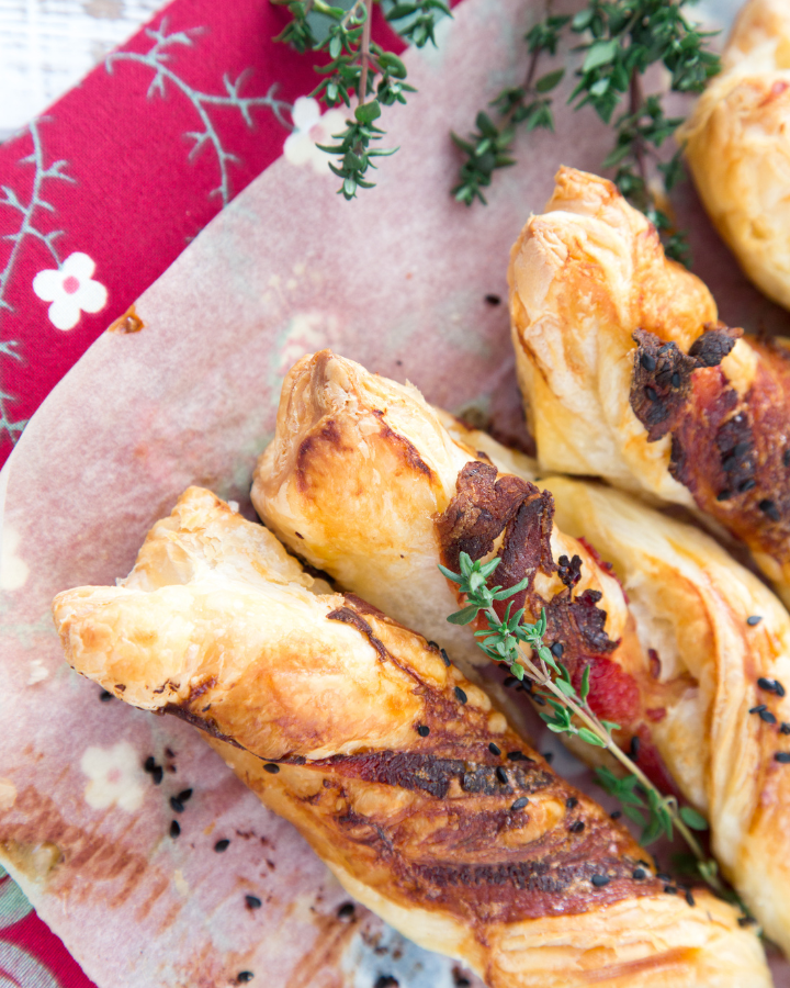 Wrap bacon in puff pastry, sprinkle with black sesame seeds and thyme, then bake until golden and crispy.