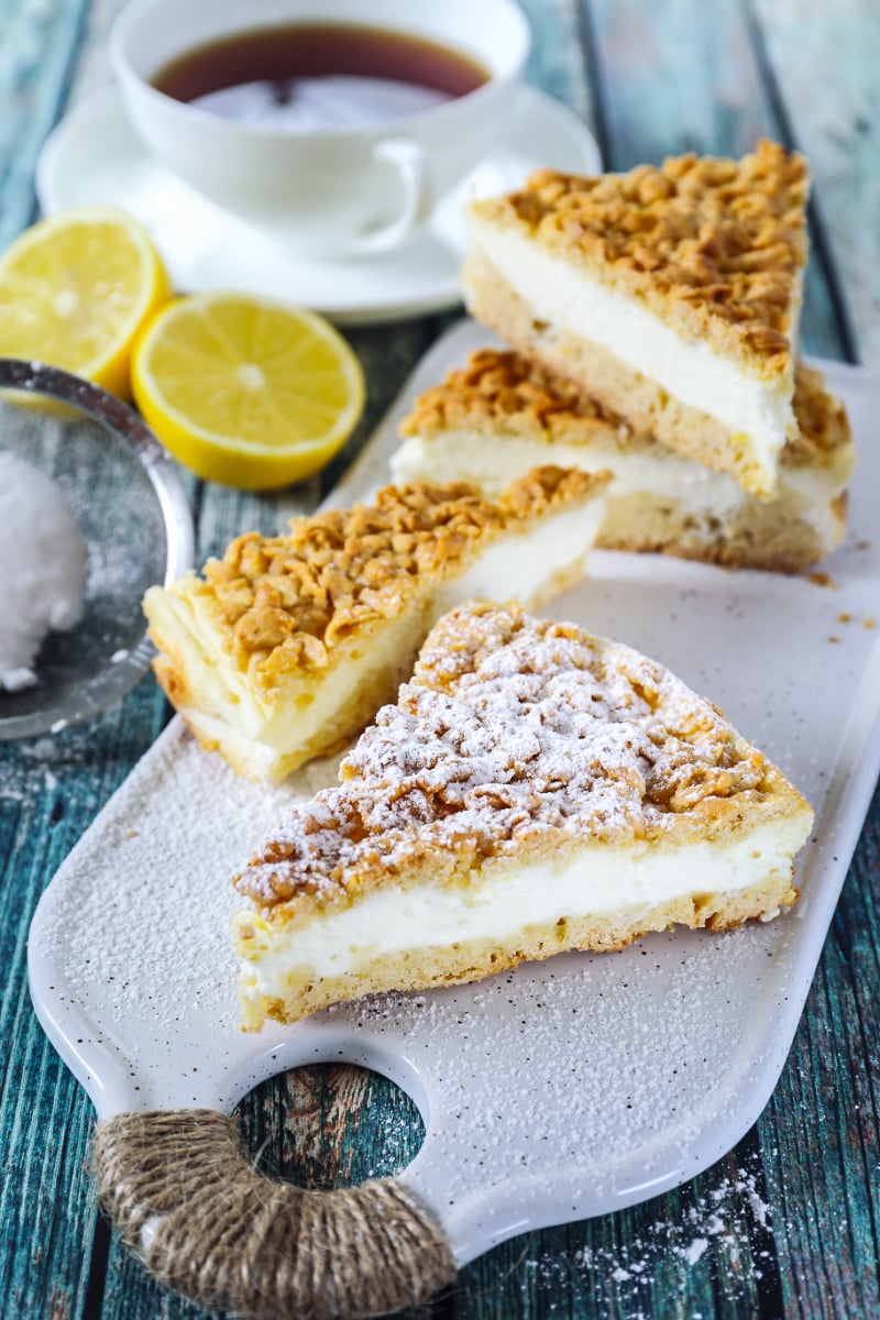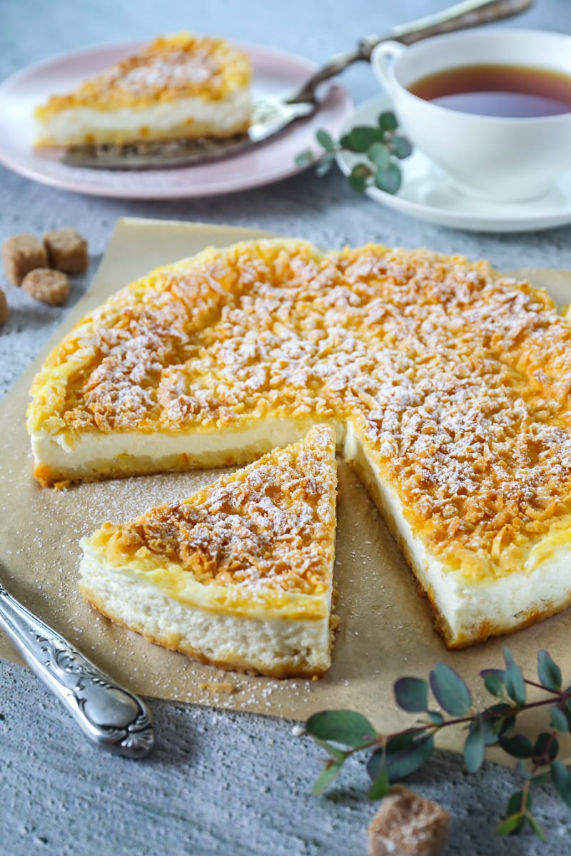 Buttery pastry crust. Creamy cottage cheese filling. Golden grated topping.