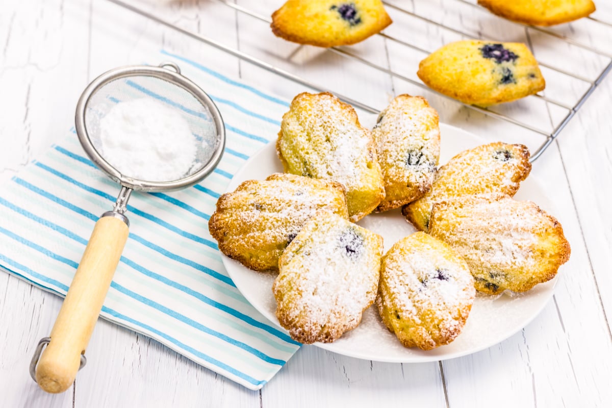 Blueberry madeleines are small French shell-shaped sponge cakes made with eggs, flour, butter, and sugar. This lighter version incorporates Greek yogurt to maintain moisture while reducing excess butter, and fresh blueberries for natural sweetness. They bake quickly and develop a soft interior with lightly golden edges.