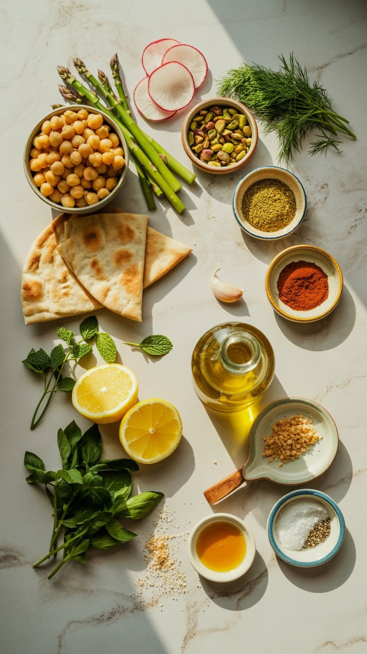 The chickpeas make it filling. The pita makes it fun. The lemon dressing keeps everything bright. And the mix of herbs, radishes, asparagus, and pistachios gives you enough texture that every bite tastes a little different.