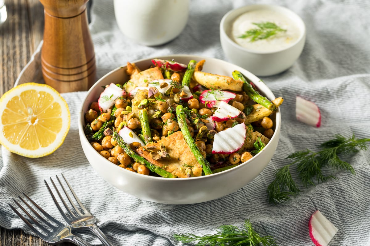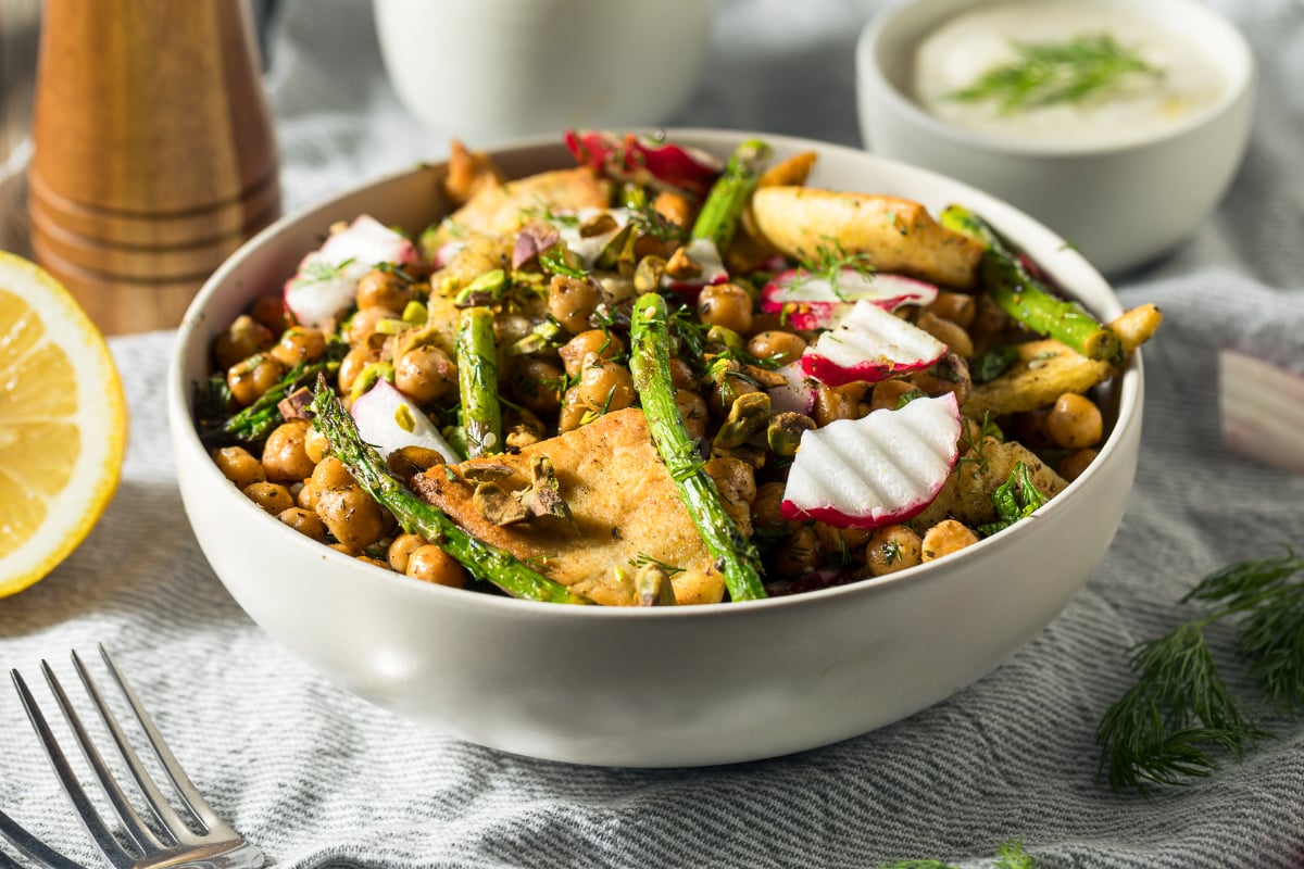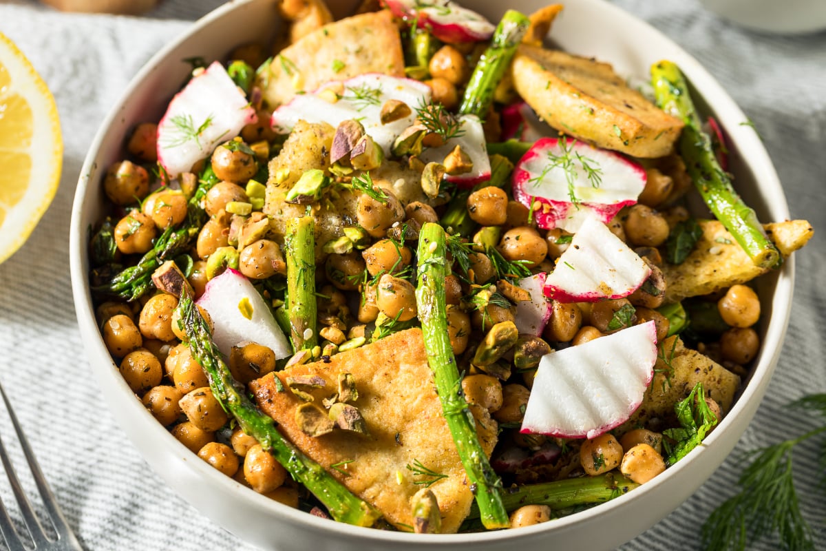 It has that happy mix of pantry-friendly and fresh-from-the-market. Chickpeas give it substance. Pita gives it crunch. Lemon and herbs make it bright. Radishes and asparagus add color and snap. And the pistachios make the whole bowl feel just a little special without getting fancy about it.