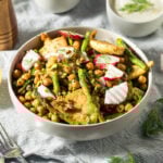 In a large bowl, add the chickpeas, cooked asparagus, sliced radishes, dill, parsley, mint if using, and chopped pistachios.