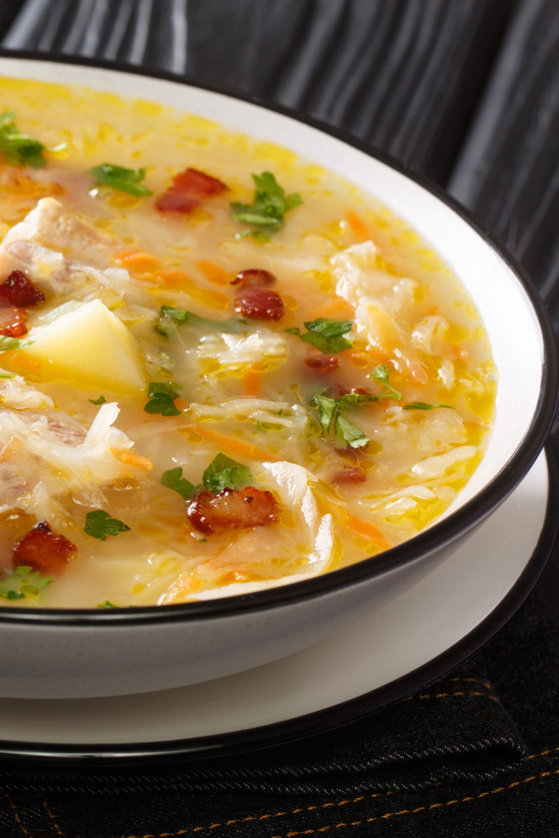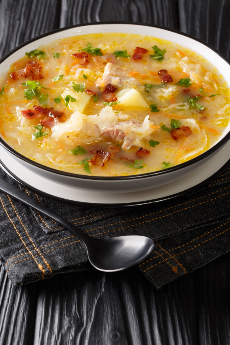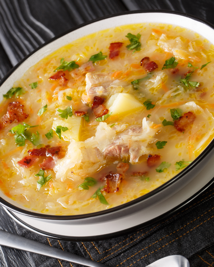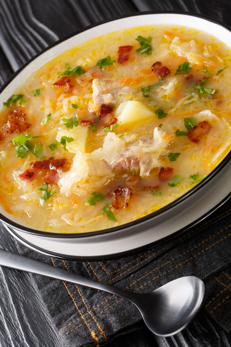 A hearty, rustic Polish soup made by simmering cabbage, potatoes, carrots, and smoked pork or kielbasa until tender and flavorful.
