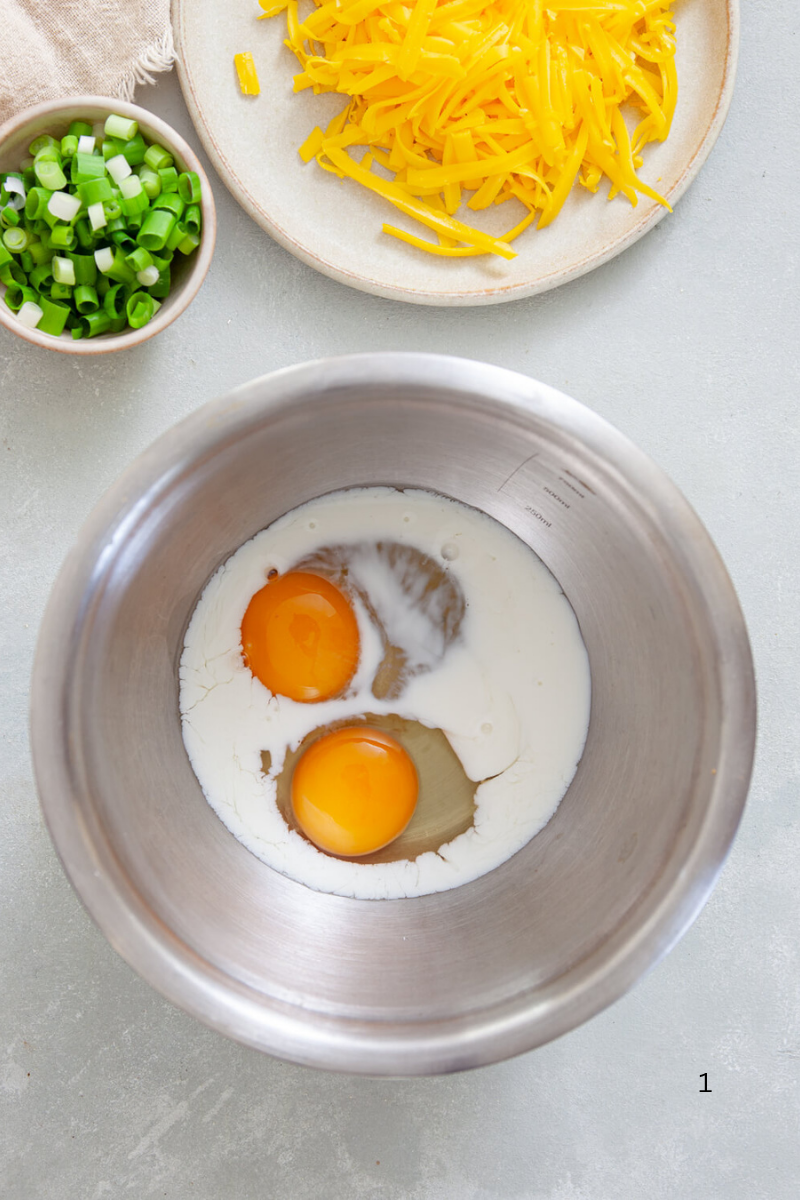 In a medium bowl, whisk together the eggs and milk until smooth and well blended. Stir in ½ cup of the shredded cheddar cheese.- Room-temperature tip: Using eggs that are closer to room temperature helps them whisk more easily and creates a fluffier set when baked.